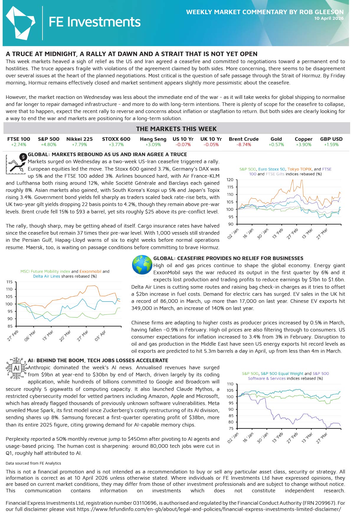 This week markets heaved a sigh of relief as the US and Iran agreed a ceasefire and committed to negotiations toward a permanent end to hostilities. The truce appears fragile with violations of the agreement claimed by both sides. More concerning, there seems to be disagreement over several issues at the heart of the planned negotiations. Most critical is the question of safe passage through the Strait of Hormuz. By Friday morning, Hormuz remains effectively closed and market sentiment appears slightly more pessimistic about the ceasefire.