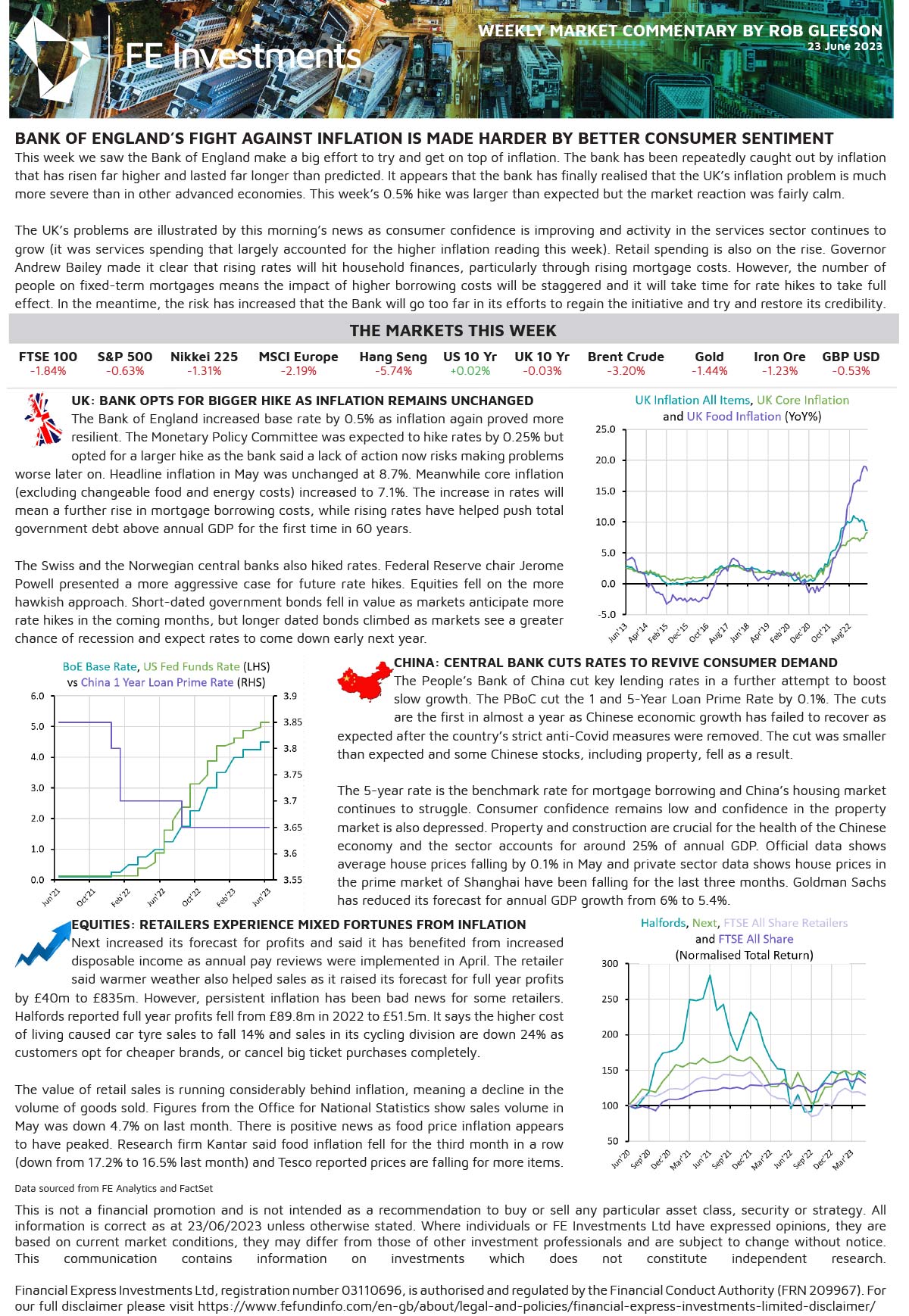 The Bank of England increased base rate by 0.5% as inflation again proved more resilient. The Monetary Policy Committee was expected to hike rates by 0.25% but opted for a larger hike as the bank said a lack of action now risks making problems worse later on. Headline inflation in May was unchanged at 8.7%. Meanwhile core inflation (excluding changeable food and energy costs) increased to 7.1%. The increase in rates will mean a further rise in mortgage borrowing costs, while rising rates have helped push total government debt above annual GDP for the first time in 60 years.