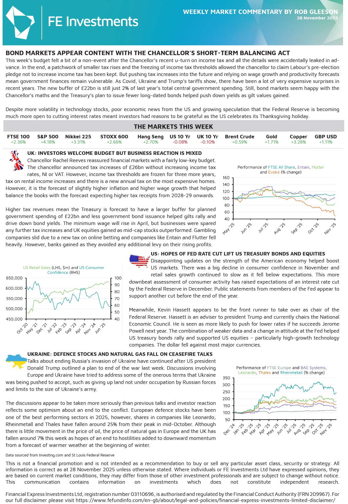 Chancellor Rachel Reeves reassured financial markets with a fairly low-key budget. The chancellor announced tax increases of £26bn without increasing income tax rates, NI or VAT. However, income tax thresholds are frozen for three more years, tax on rental income increases and there is a new annual tax on the most expensive homes. However, it is the forecast of slightly higher inflation and higher wage growth that helped balance the books with the forecast expecting higher tax receipts from 2028-29 onwards.