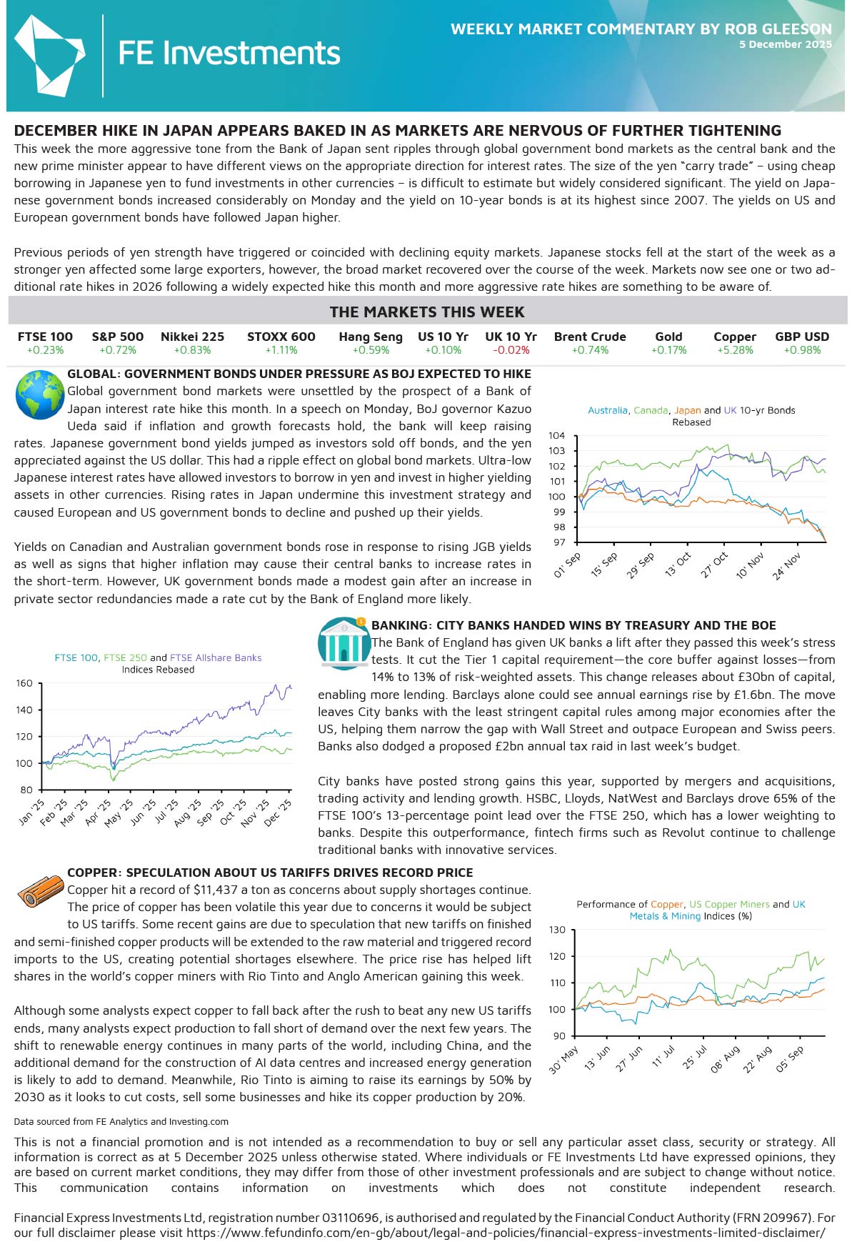 This week the more aggressive tone from the Bank of Japan sent ripples through global government bond markets as the central bank and the new prime minister appear to have different views on the appropriate direction for interest rates. The size of the yen “carry trade” – using cheap borrowing in Japanese yen to fund investments in other currencies – is difficult to estimate but widely considered significant. The yield on Japa- nese government bonds increased considerably on Monday and the yield on 10-year bonds is at its highest since 2007. The yields on US and European government bonds have followed Japan higher.