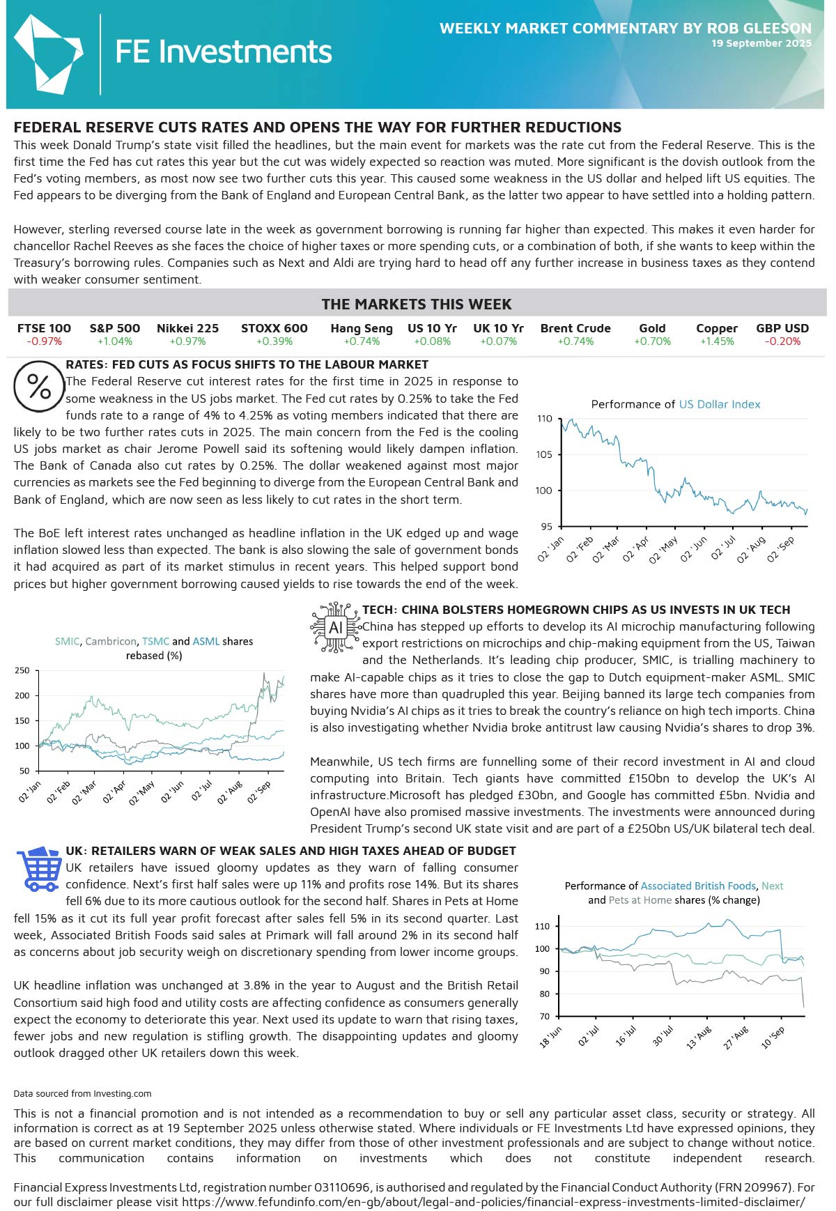 This week Donald Trump’s state visit filled the headlines, but the main event for markets was the rate cut from the Federal Reserve. This is the first time the Fed has cut rates this year but the cut was widely expected so reaction was muted. More significant is the dovish outlook from the Fed’s voting members, as most now see two further cuts this year. This caused some weakness in the US dollar and helped lift US equities. The Fed appears to be diverging from the Bank of England and European Central Bank, as the latter two appear to have settled into a holding pattern.