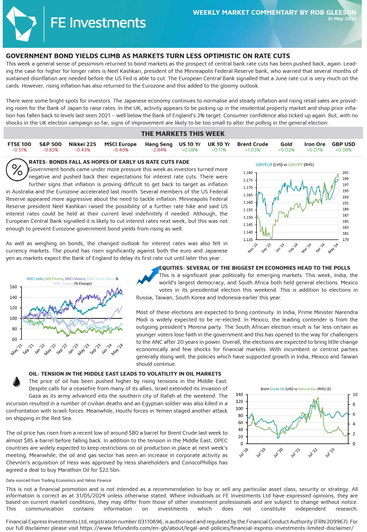 This week a general sense of pessimism returned to bond markets as the prospect of central bank rate cuts has been pushed back, again. Leading the case for higher for longer rates is Neel Kashkari, president of the Minneapolis Federal Reserve bank, who warned that several months of sustained disinflation are needed before the US Fed is able to cut. The European Central Bank signalled that a June rate cut is very much on the cards. However, rising inflation has also returned to the Eurozone and this added to the gloomy outlook.