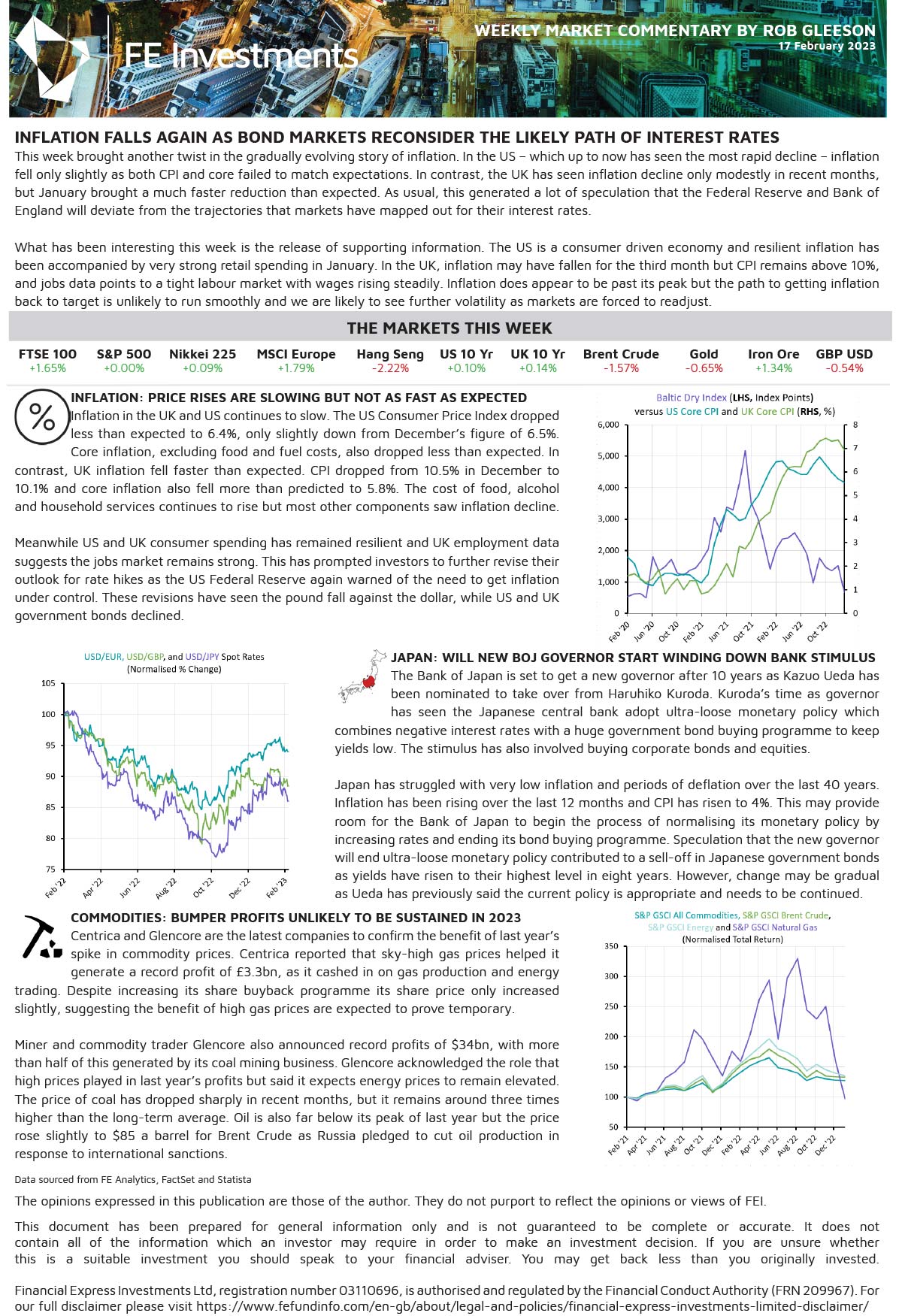 What has been interesting this week is the release of supporting information. The US is a consumer driven economy and resilient inflation has been accompanied by very strong retail spending in January. In the UK, inflation may have fallen for the third month but CPI remains above 10%, and jobs data points to a tight labour market with wages rising steadily. Inflation does appear to be past its peak but the path to getting inflation back to target is unlikely to run smoothly and we are likely to see further volatility as markets are forced to readjust.