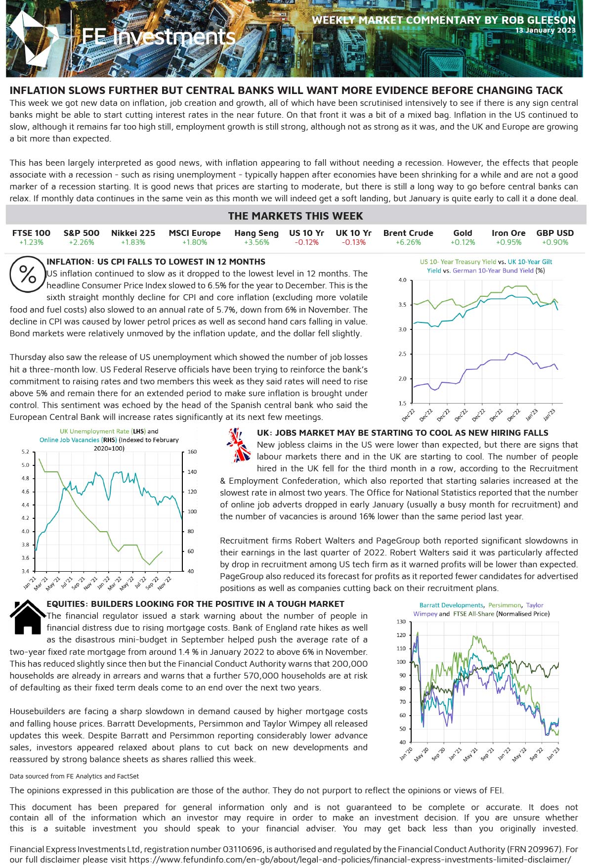 New jobless claims in the US were lower than expected, but there are signs that labour markets there and in the UK are starting to cool. The number of people hired in the UK fell for the third month in a row, according to the Recruitment & Employment Confederation, which also reported that starting salaries increased at the slowest rate in almost two years. The Office for National Statistics reported that the number of online job adverts dropped in early January (usually a busy month for recruitment) and the number of vacancies is around 16% lower than the same period last year.